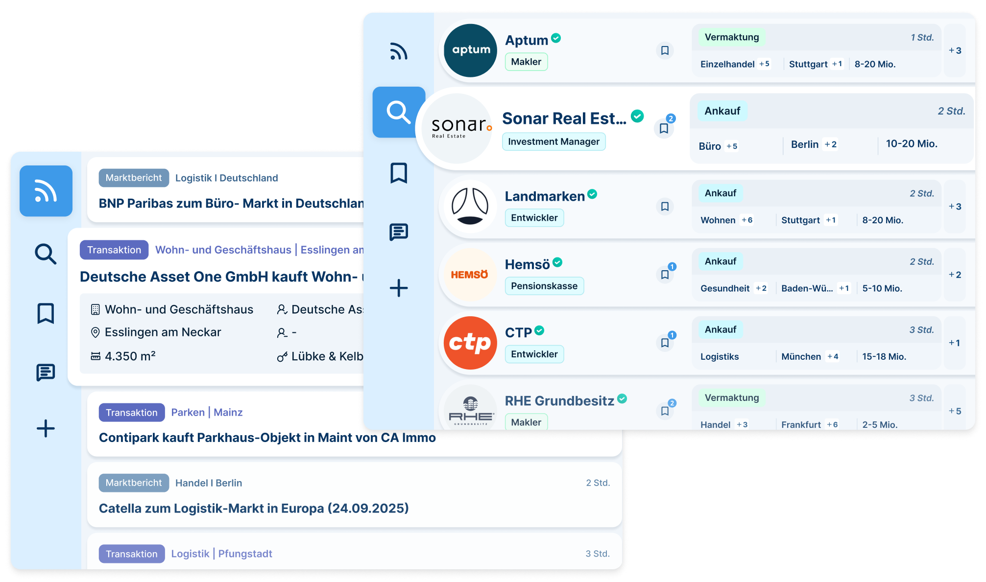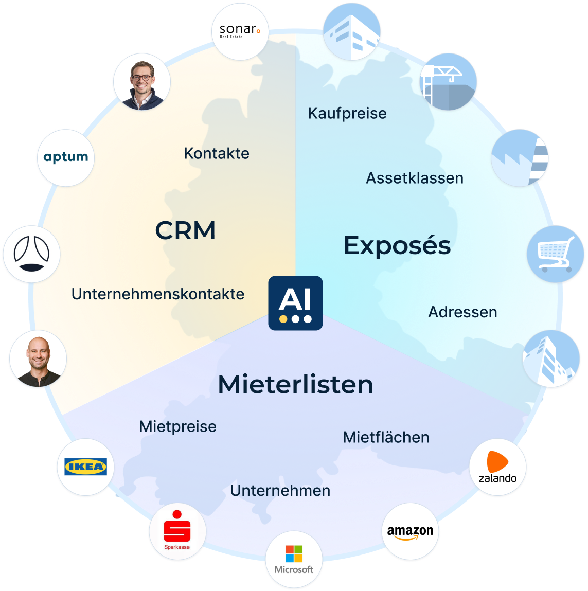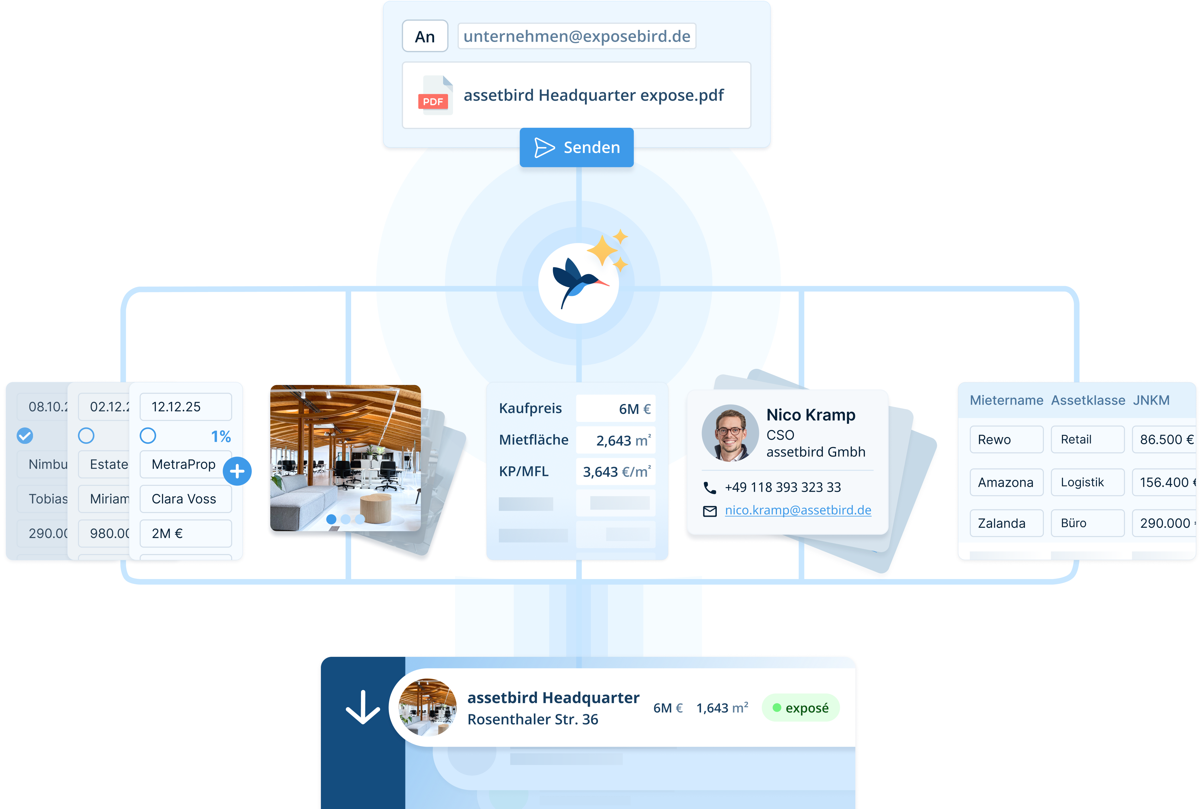 Exposés, Mieterlisten und Kontaktdaten werden automatisch erfasst. Dokumente strukturiert abgelegt. Bestehende Vorkenntnis- und Kontaktlisten sauber bereinigt und übernommen. Ein durchgängiger 360°-Service für den Immobilienankauf. Unterstützt von assetbird Intelligence (AI) - entwickelt, um deine Prozesse wirklich zu vereinfachen.