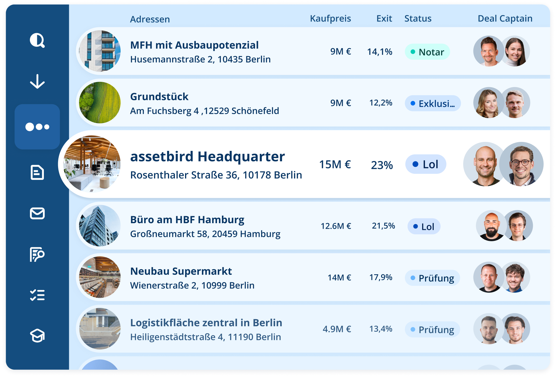 Teams verwenden häufig 10 Jahre alte Software, die der Komplexität und den heutigen Ansprüchen nicht mehr gerecht werden können. Dabei legt der Ankauf den Grundstein für jedes erfolgreiche Immobilieninvestment. Durch die Digitalisierung des ersten Schrittes mit assetbird reduzieren wir den vorherigen Zeitaufwand von Immobilienprüfung, Team-Abstimmung und Ankauf erheblich.